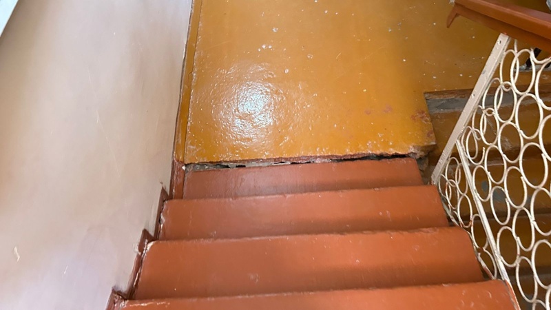 Екі қабатты ғимараттың қабырғасы қақ айырылып тұр, іште баспалдақ та орнынан қозғалған.