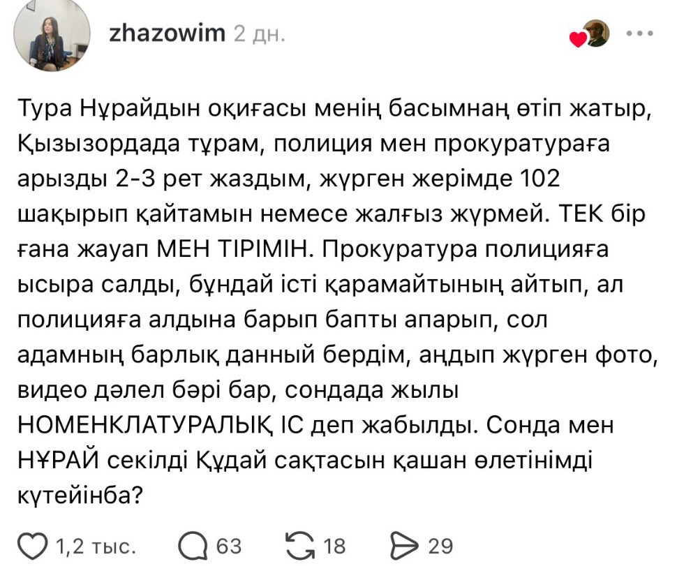 «Тура Нұрайдың оқиғасы басымнан өтіп жатыр. Қызылордада тұрамын. Полиция мен прокуратураға бірнеше рет арыз жаздым. Қауіпсіздігім үшін жалғыз жүрмеуге тырысамын, кейде тіпті 102-ге хабарласуға мәжбүр боламын, жалғыз жүрмеймін. Тек бір ғана жауап – мен тірімін», – дейді ол.