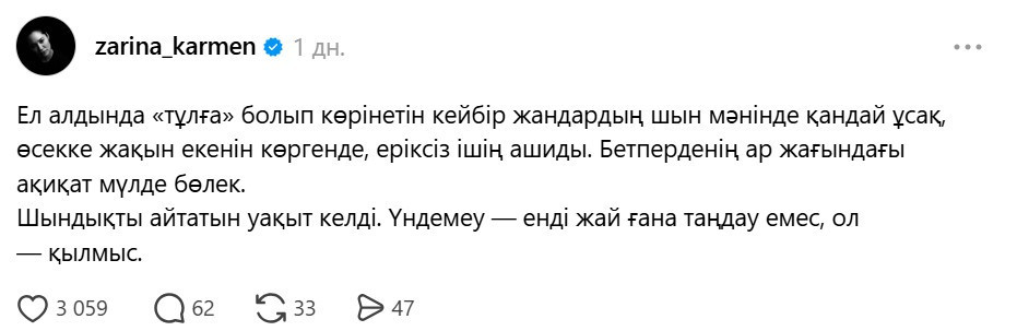 Өсекке жақын екенін көргенде, ішің ашиды... : актриса Зарина Карменнің жазбасы оқырманды ойландырып қойды