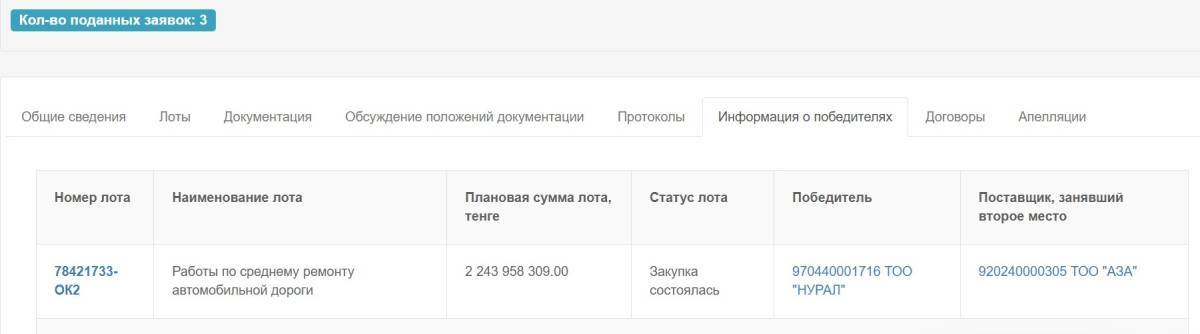 Айта кетерлігі, тағы бір конкурста — №77917425-ОК3 лоты, құны 325,6 млн теңге, KS-4 Беловка–Қалқаман жолын жөндеуге қатысты — бұл жолы «ИНЭК Kazakhstan» ЖШС жеңімпаз деп танылады.