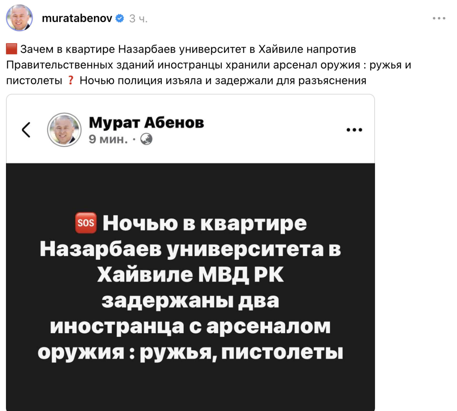 "Түнде "Хайвилл" ауданындағы пәтерде қару-жарақ арсеналы: мылтықтар, тапаншалар табылып, екі шетелдік ұсталды", - делінген оның жазбасында.