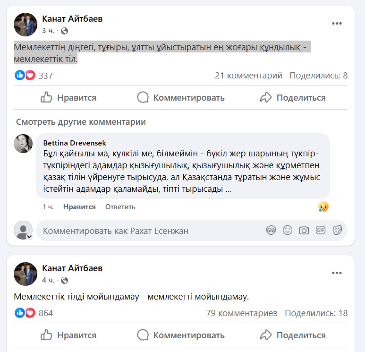 "Мемлекеттік тілді мойындамау – мемлекетті мойындамау. Мемлекеттің діңгегі, тұғыры, ұлтты ұйыстыратын ең жоғары құндылық – мемлекеттік тіл", – деп жазды Қанат Айтбаев.