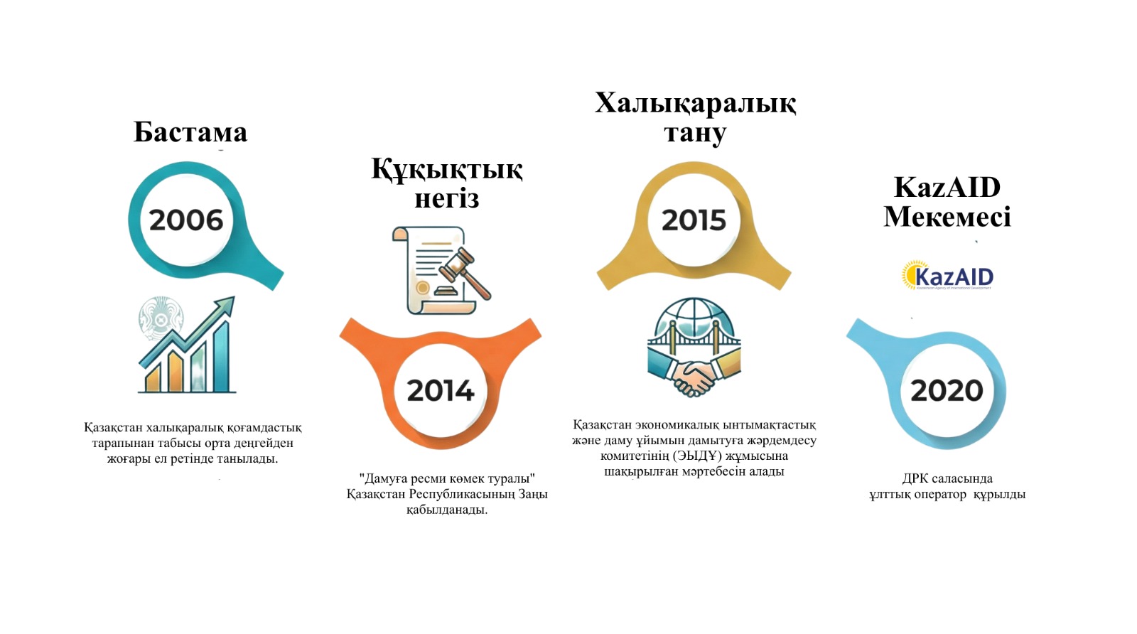 2006 жыл: халықаралық қоғамдастық Қазақстанды табысы орташадан жоғары ел деп таниды, бұл ДРК ұсынатын ел жаңа рөлге көшудің бастапқы нүктесі болды. 2014 жыл: "Дамуға ресми көмек туралы" Қазақстан Республикасының Заңы қабылданады, ол құқықтық базаны құрады және көмек көрсетудің барлық процесін жүйелейді. 2015 жыл: Қазақстан экономикалық ынтымақтастық және даму ұйымын дамытуға жәрдемдесу комитетінің (ЭЫДҰ) жұмысына шақырылған мәртебесін алады, бұл оның халықаралық деңгейде күш-жігерін мойындағанын куәландырады. 2020 жыл: Қазақстан Республикасының Үкіметі институционалдық құрылымды қалыптастыруды аяқтай отырып, ДРК саласындағы ұлттық оператор ретінде "KazAID" Қазақстандық халықаралық даму агенттігін құрады.Алғашқы бес жылдағы KazAID қызметінің ауқымын толық түсіну үшін негізгі сандық көрсеткіштерге жүгіну қажет.