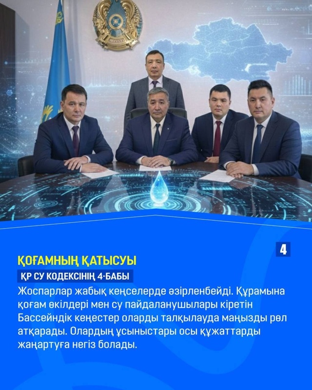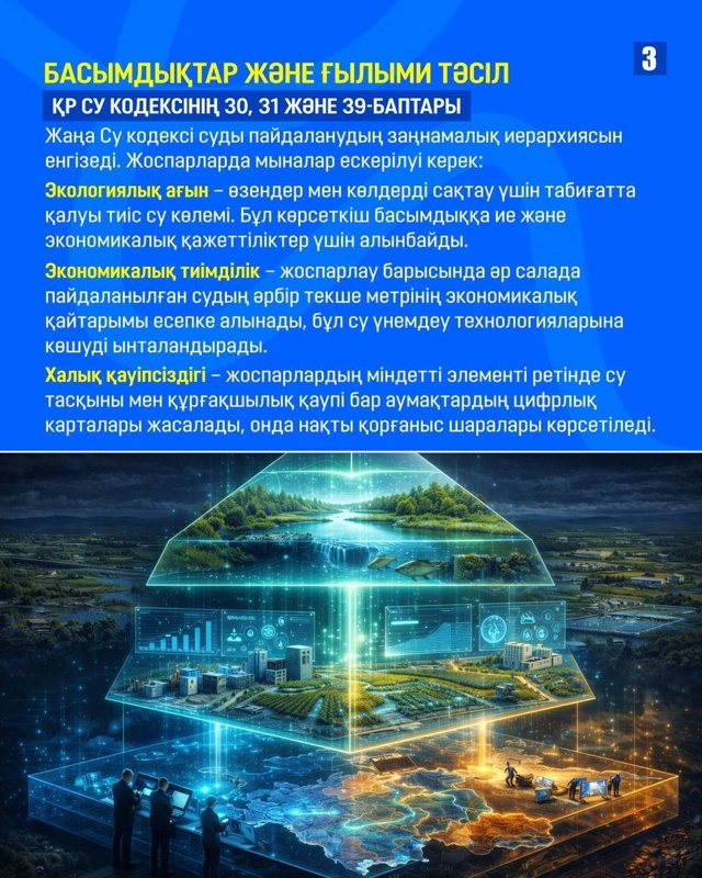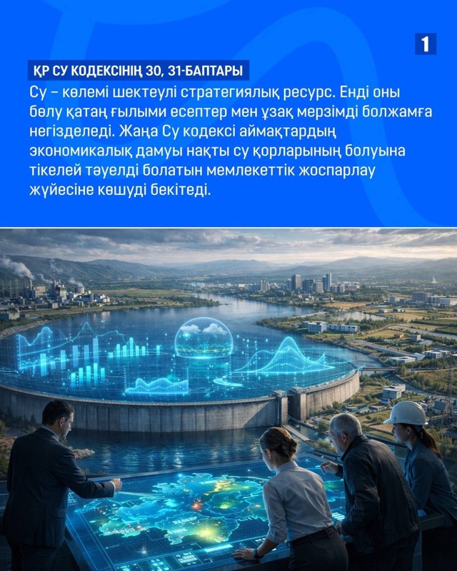 1.Су — көлемі шектеулі стратегиялық ресурс. Енді оны бөлу қатаң ғылыми есептер мен ұзақ мерзімді болжамға негізделеді. Жаңа Су кодексі аймақтардың экономикалық дамуы нақты су қорларының болуына тікелей тәуелді болатын мемлекеттік жоспарлау жүйесіне көшуді бекітеді.