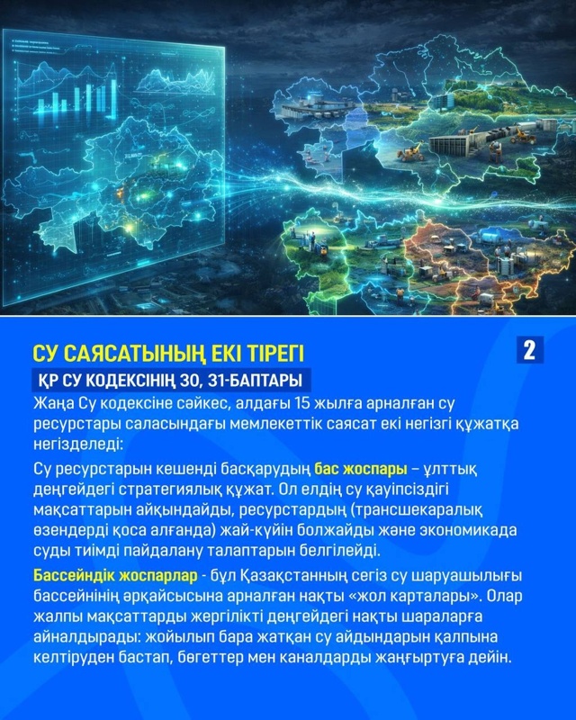 Жаңа Су кодексіне сәйкес, алдағы 15 жылға арналған су ресурстары саласындағы мемлекеттік саясат екі негізгі құжатқа негізделеді: