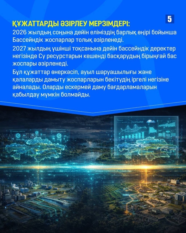 2027 жылдың үшінші тоқсанына дейін бассейндік деректер негізінде Су ресурстарын кешенді басқарудың бірыңғай бас жоспары әзірленеді.
