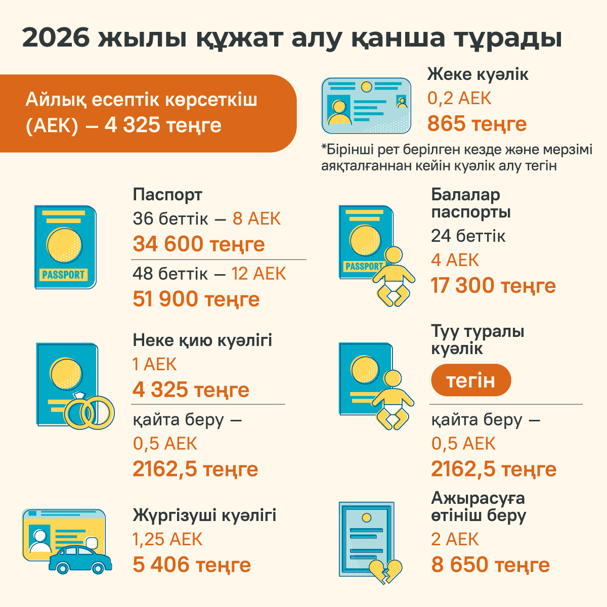 2026 жылдың 1 қаңтарынан бастап Қазақстанда айлық есептік көрсеткіш (АЕК) 4325 теңгеге дейін өсті. 2025 жылы АЕК 3932 теңгені құраған еді. Көптеген мемлекеттік қызмет пен алымның бағасы АЕК-ке байланысты болғандықтан құжаттарды рәсімдеу 10%-ға өседі.
