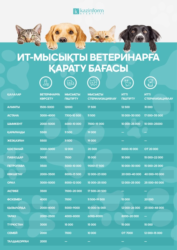 Петропавл мен Ақтөбе қалаларында баға орташадан сәл жоғары болып тұр. Ит пен мысықты қарату бағасы 3 500 теңге. Өскеменде – 4 000 теңге. Ал Қарағанды мен Жезқазғанда төрт аяқты досыңызды қарап, диагноз қою үшін мал дәрігері 5 500 теңге сұрайды.