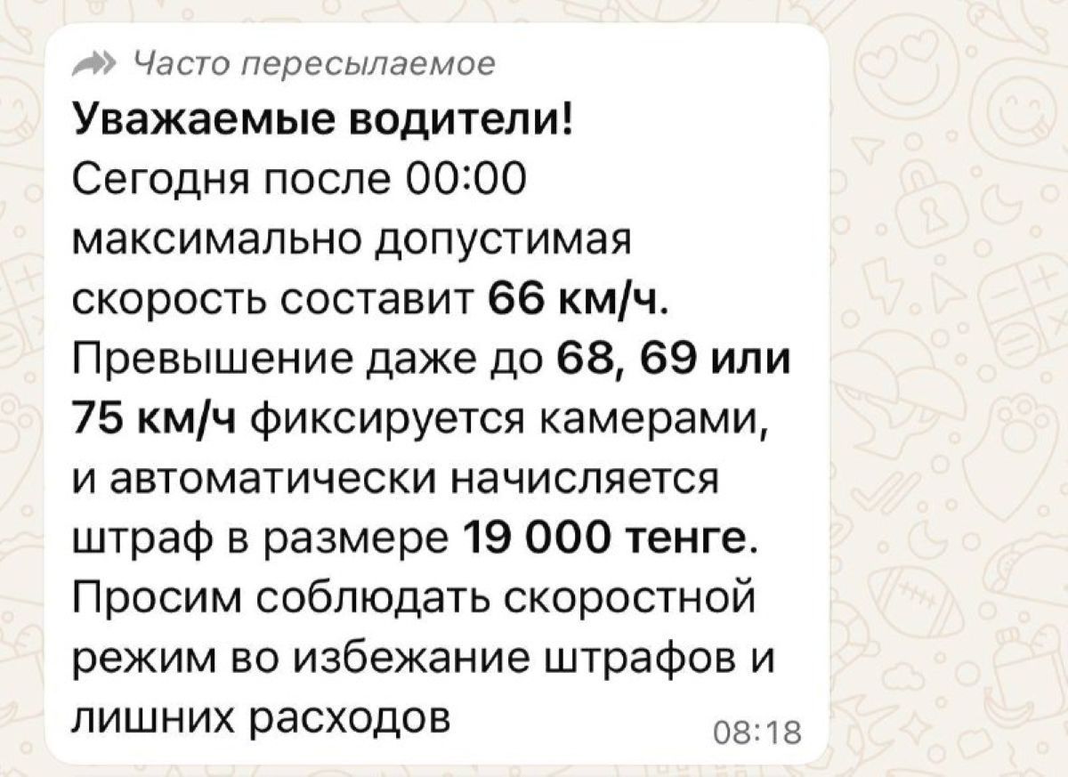 Әлеуметтік желіде жаңа жылдамдық шектеуі туралы ақпарат тарап жатыр - «сағат 00:00-ден кейін 66 км/сағ». Ішкі істер министрлігі мен жол қызметтері бұл хабарламаны жалған ақпарат деп, жоққа шығарды.