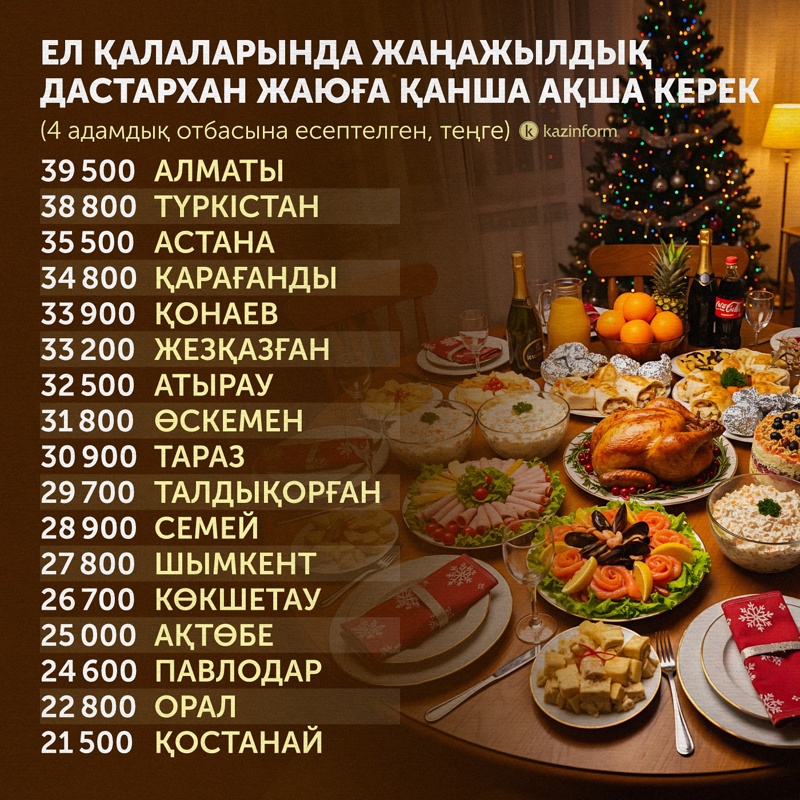 Еліміздің қалаларындағы дастархан жою құнын есептеп, кейбір өңірлер арасынан екі есе айырмашылықты көрдік. Аймақтарда баға әртүрлі болғанымен, көпшілік біз таңдаған салат, жеміс пен кондитерлік өнімді, ыстық тамақты үстел үстіне қояды. Тек баға өзгеше. Жаңа жыл түні чектегі сома емес, көңіл-күй, салт пен отбасындағы ыстық ықылас қана маңызды екенін көреміз.