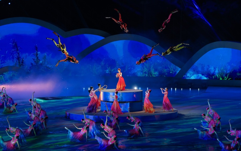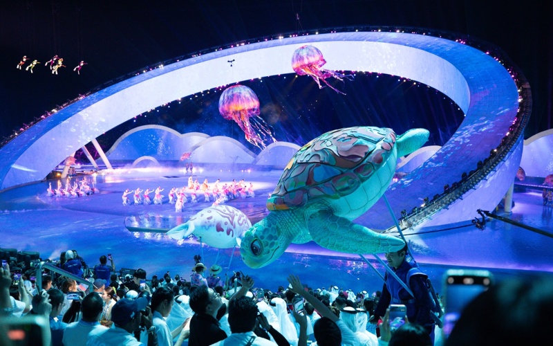 Шоудың көрнекі бөлігінде заманауи технологиялар Қытайдың мәдени элементтерімен үйлесім тапты. Қойылым барысында сценарийге енгізілген роботтандырылған элементтер, түрлі арнайы эффектілер және адам мен табиғат үйлесімін бейнелейтін теңіз жануарлары пішініндегі ірі көркем инсталляциялар қолданылды. Салтанат соңында 2026 жылғы жағажай Азия ойындарының алауы салтанатты түрде жағылды.