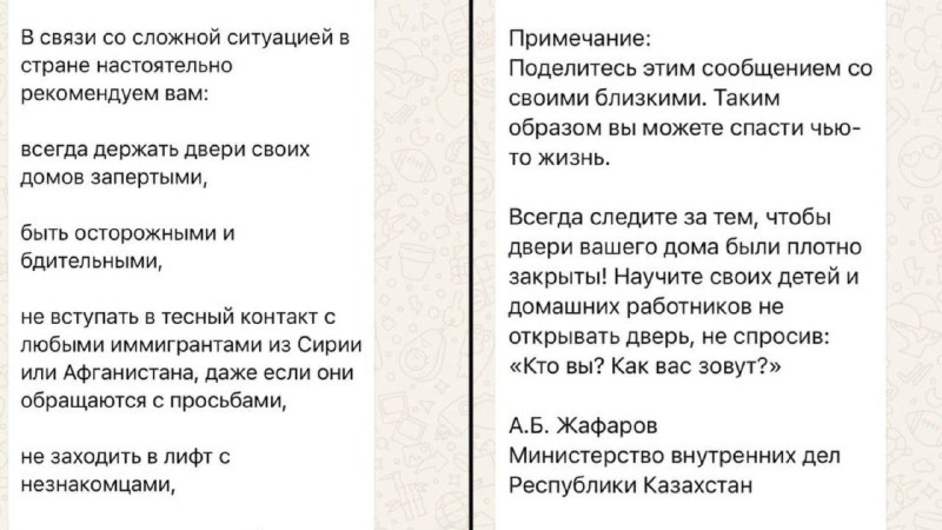 Әлеуметтік желілер мен мессенджерлерде Ішкі істер министрлігі атынан "шұғыл хабарландыру" тарады. Онда "Сирия мен Ауғанстаннан келген кез келген иммигрантпен тығыз қарым-қатынасқа түспеу" ескертілген.