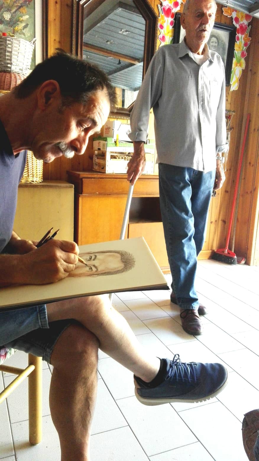 Суреттерде: Каратон портреті; Италиялық партизандардың айтуымен Каратон портретін салу кезі. Марио Натти (Mario Nanni) және Франко Фонтана (Franco Fontana) Болонья, 18.06.2019 ж. Суреттерді түсірген Клаудио Спано