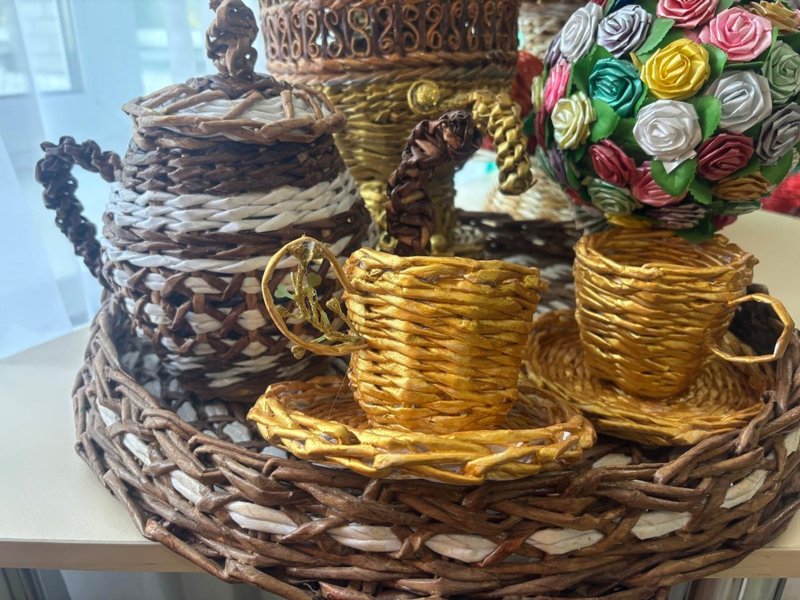 — Людмила есімді әріптесім бар, бірде оның тоқыған вазасын көріп, қатты қызықтым. Ол дайын бұйымдарын бояу үшін кәдімгі йодты қолданады. Мен әрі қарай ізденіп, тоқылған заттар әдемі болуы үшін арнайы бояулар қолданамын. Ең қымбаты — дайын бұйымға қолданылатын лак. Алтын, күміс түстес арнайы бояулары баллондарда сатылады, олардың да бағасы арзан емес. Желім де көп керек, өйткені түтікше етіп оралған әр қағазды желімдеу қажет, — дейді Эльвира Жахина.