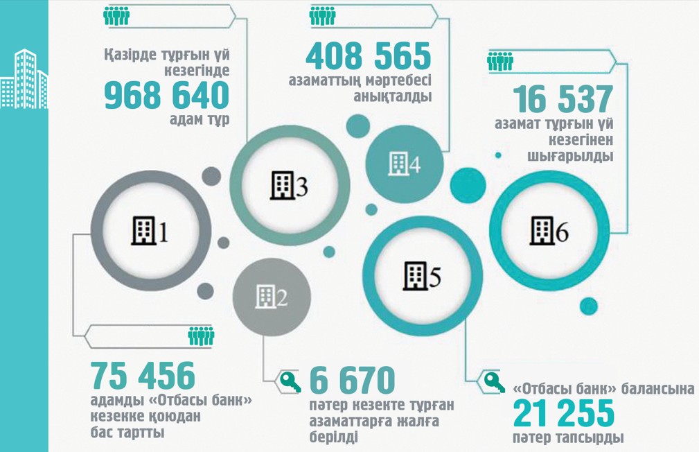 Қазір тұрғын үй кезегінде 968 640 адам тұр. Оның шамамен 30%-ы немесе 306 632 адам тұрғын үй алуға бірінші кезектегі құқыққа ие. Бұл – тұрғын үй мәселесін өз бетінше шешуі қиын азаматтар санаты, сондықтан мемлекеттік қолдау шаралары дәл осы топқа бағытталған.