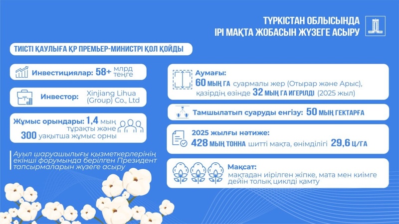 — Инвестор — қытайлық Xinjiang Lihua (Group) Co., Ltd. компаниясы. Жобаны жүзеге асырудың бірінші кезеңінде 58 млрд теңгеден астам инвестиция көзделген, шетелдік инвестициялардың жалпы көлемі 200 млрд теңгеден асады, бұл туралы бұрын Премьер-министр Олжас Бектенов пен Xinjiang Lihua басшысы Чжан Цихайдың келіссөздері барысында уағдаластықтарға қол жеткізілген болатын, — делінген хабарламада.