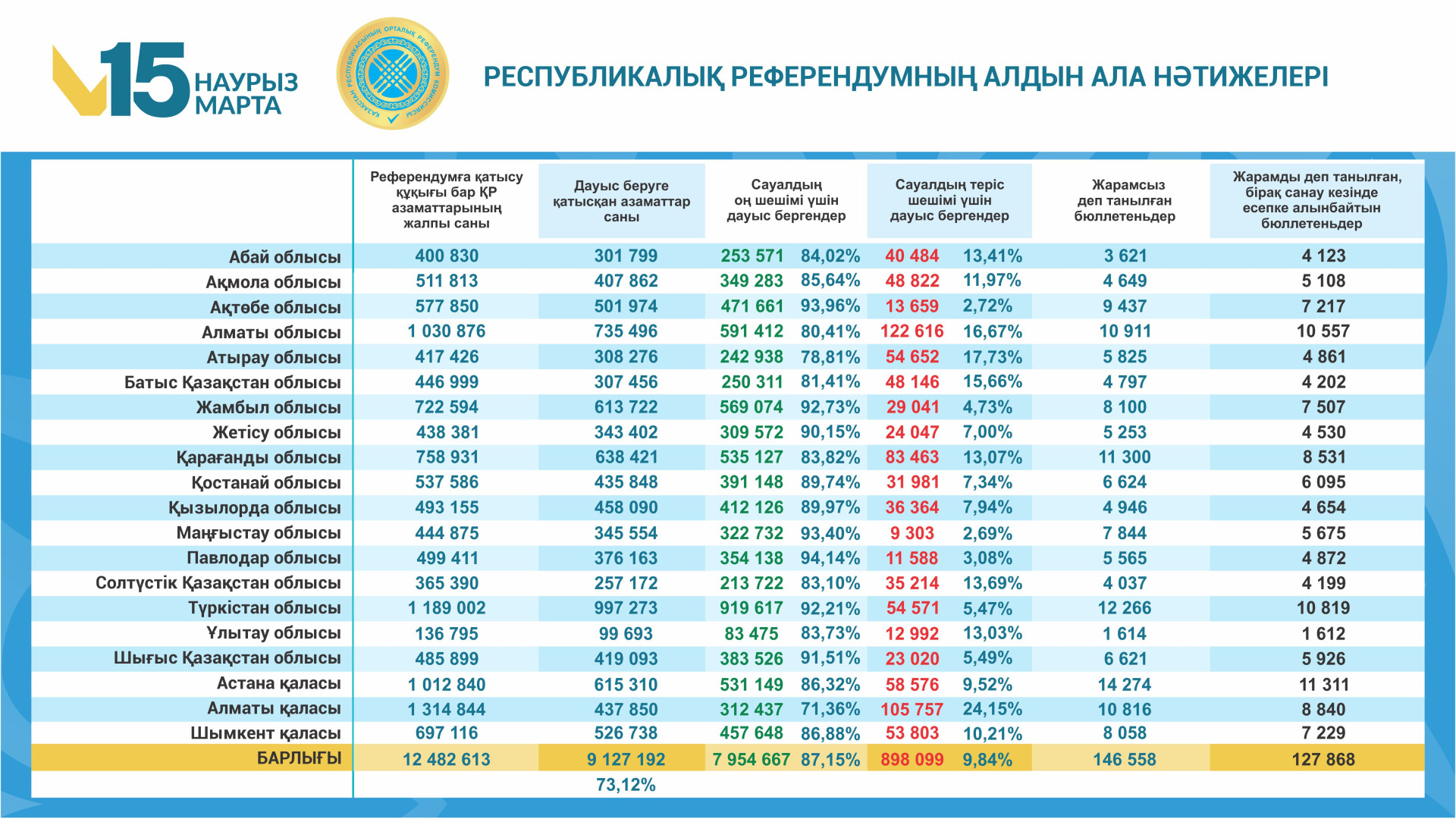 Алынған мәліметтерге сәйкес, референдумға қатысуға құқығы бар Қазақстан Республикасы азаматтарының жалпы саны 12 миллион 482 мың 613 адамды құрады.