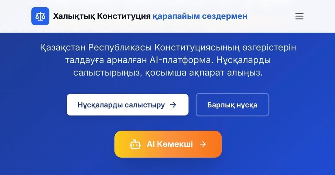 Жобаны «AMANAT» партиясы фракциясының мүшесі, Мәжіліс депутаты Әбутәліп Мүтәлі (https://www.instagram.com/p/DVqPRRQjcy5/?igsh=MXQzOG12Mmd0bmVuNQ==) таныстырды. Бұл – Қазақстан Республикасы Конституциясындағы өзгерістерді түсінуге және негізгі заңның әртүрлі редакцияларын салыстыруға көмектесетін чат-боты бар AI-сервис.