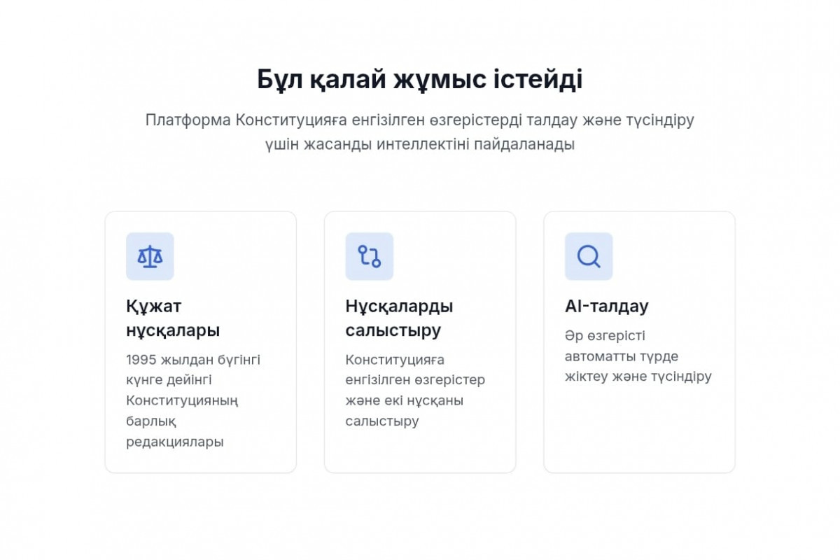 Платформа енгізілген түзетулерді талдау және оларды ұғынықты етіп түсіндіру үшін жасанды интеллект технологияларын пайдаланады. Нақты уақыт режимінде әрбір азамат еркін түрде сұрақ қойып, баптардағы нақты өзгерістерді көріп, олардың мазмұнына қатысты жан-жақты түсіндірме ала алады.