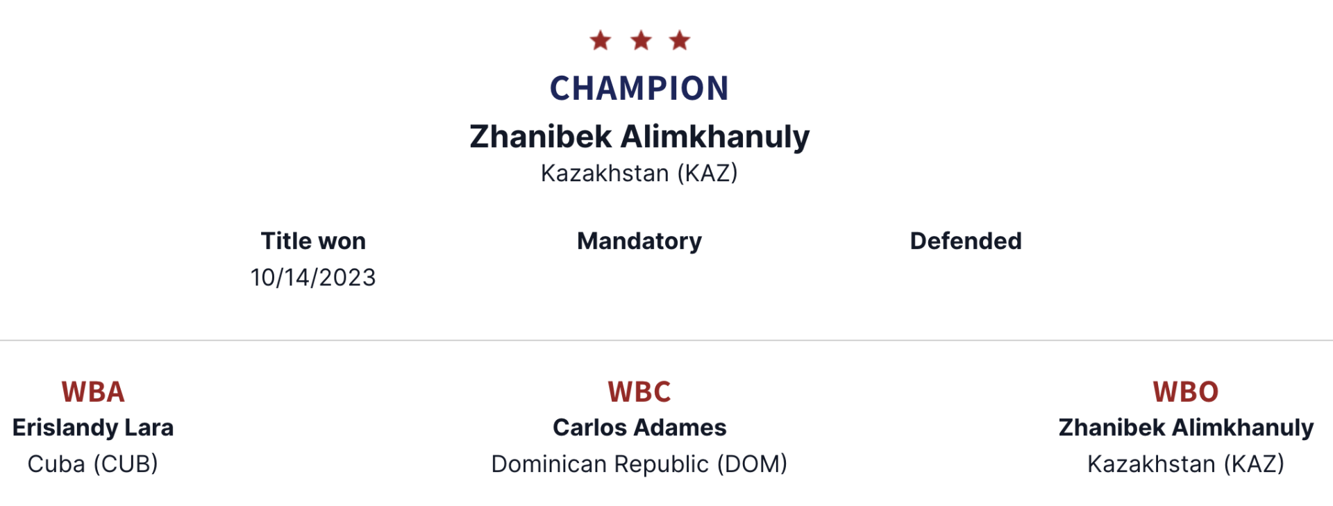 WBO 2026 жылғы қаңтарға арналған жаңартылған рейтингті жариялады. Тізімге сәйкес, орта салмақта WBO және IBF белбеулерінің иегері, қазақстандық әлем чемпионы Жәнібек Әлімханұлы өз орнын бермей, көшбасшылардың бірінші қатарында тұр.
