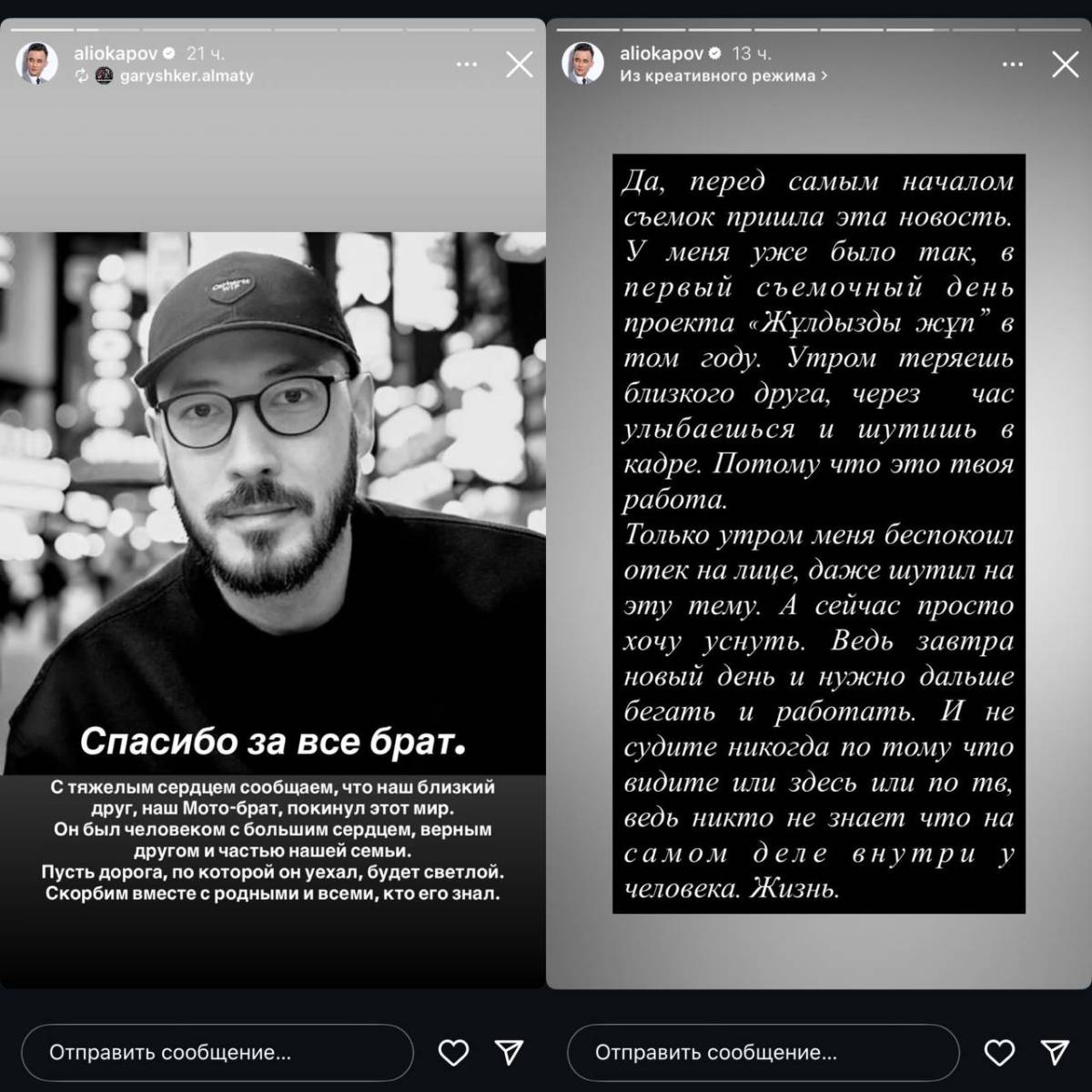 "Ғалым, қош бол бауырым. Жатқан жерің жайлы болсын. Барлығы үшін рақмет, бауыр. Ауыр жүрекпен хабарлаймыз: біздің жақын досымыз, Мото-бауырымыз бұл дүниеден өтті. Ол кең жүректі, адал дос, әрі отбасымыздың бір бөлігі болған адам еді. Жақындарына және оны таныған барлық жандарға көңіл айтамыз. Иә, түсірілім басталардың дәл алдында осы жаңалық келді. Менде мұндай бұрын да болған – өткен жылы "Жұлдызды жұп" жобасының алғашқы түсірілім күні. Таңертең жақын досыңнан айырылып, бір сағаттан кейін кадрда күліп, әзілдеп тұрасың. Себебі бұл – сенің жұмысың. Ал қазір жай ғана ұйықтап қалғым келеді. Өйткені ертең жаңа күн басталады, әрі қарай жүгіріп, жұмыс істеу керек. Және ешқашан адамның теледидардан немесе осында, әлеуметтік желіден көрген кейпіне қарап пікір жасамаңыздар. Себебі ешкім адамның ішінде шын мәнінде не болып жатқанын білмейді. Өмір", – деп жазды өнер иесі.