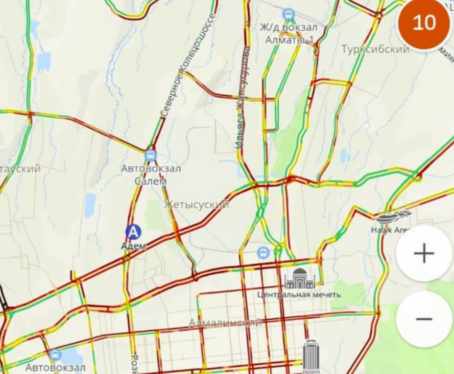 Согласно информации сервиса 2GIS, уровень загруженности дорог в мегаполисе достиг максимальных 10 баллов. Наиболее серьёзные заторы наблюдаются на основных транспортных магистралях, включая проспекты Райымбека, Толе би, Аль-Фараби и Сатпаева, а также улицы Розыбакиева и Сейфуллина.