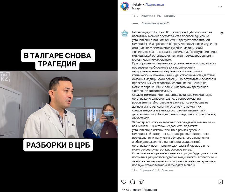 В пресс-службе Талгарской ЦРБ подчеркнули, что обстоятельства произошедшего пока не установлены в полном объеме и требуют объективной медицинской и правовой оценки. До получения официального заключения судебно-медицинской экспертизы делать выводы о виновности медиков преждевременно и юридически некорректно.