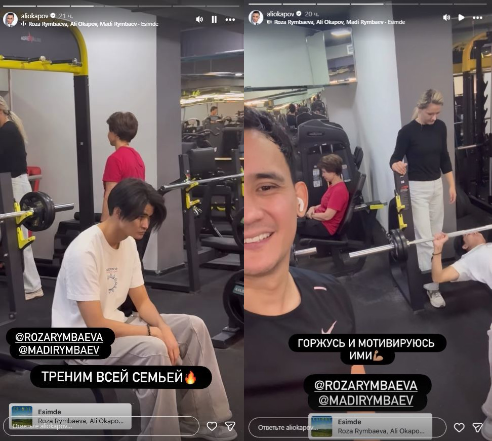 Казахстанский певец, сын Рымбаевой Али Окапов поделился в своих соцсетях кадрами из тренажерного зала. На видео видно, что вместе с ним тренируются сама артистка и его младший брат Мади Рымбаев.