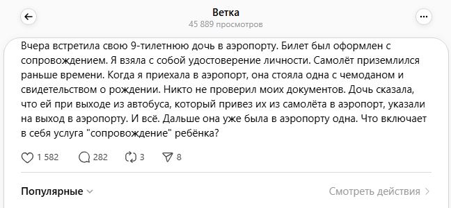 “Самолет приземлился раньше времени. Когда я приехала в аэропорт, она стояла одна с чемоданом и свидетельством о рождении. Никто не проверил моих документов. Дочь сказала, что ей при выходе из автобуса, который привез их из самолета в аэропорт, указали на выход в аэропорту. И все. Дальше она уже была в аэропорту одна. Что включает в себя услуга "сопровождение" ребенка?” – задается вопросом автор поста.