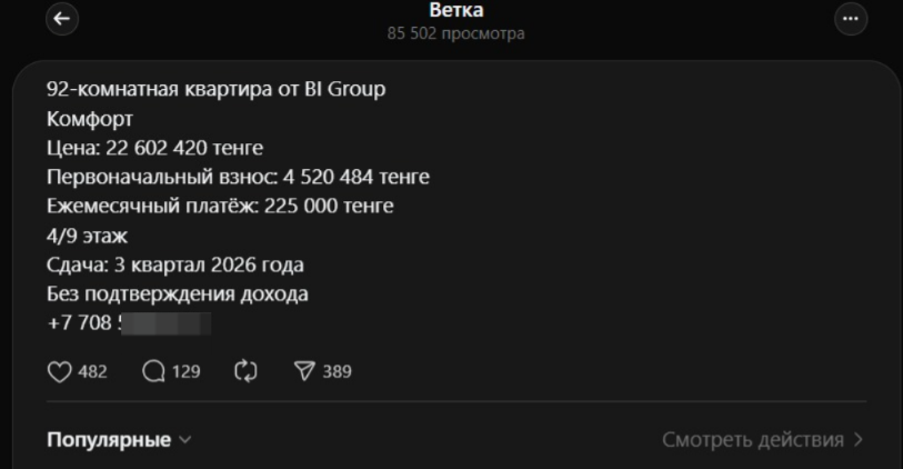 Автор публикации указал весьма заманчивые условия: первоначальный взнос – 4 520 484 тенге, ежемесячный платеж – 225 тысяч тенге, 4-й этаж из 9, сдача в третьем квартале 2026 года и даже без подтверждения дохода.