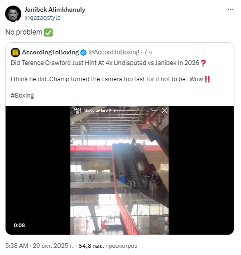 К слову, Алимханулы также принял этот вызов от Кроуфорда, репостнул запись и подписал: "Нет проблем".