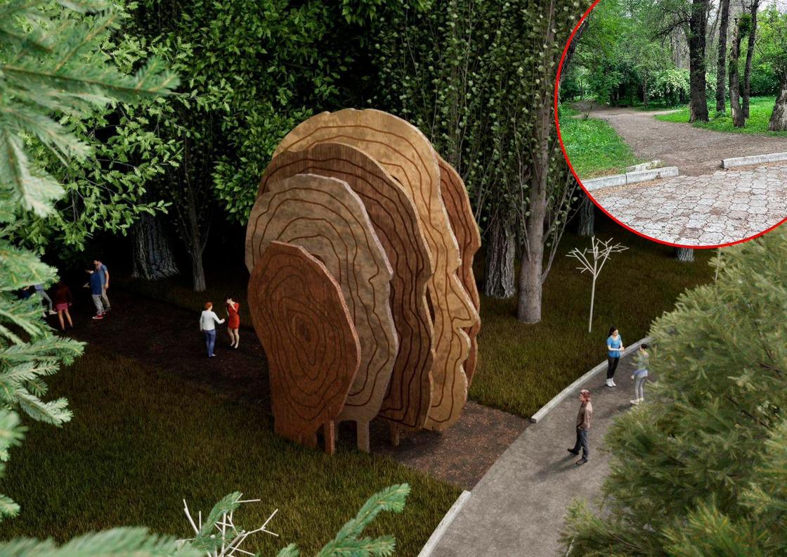 У южного входа со стороны проспекта Суюнбая разместится инсталляция, посвященная Эдуарду Бауму — основателю рощи. Она выполнена из отдельных фрагментов, которые под определенным углом складываются в портрет ученого. Вторая композиция — "Годичные кольца", у входа со стороны улицы Сейфуллина, символизирует время, рост и непрерывное развитие.