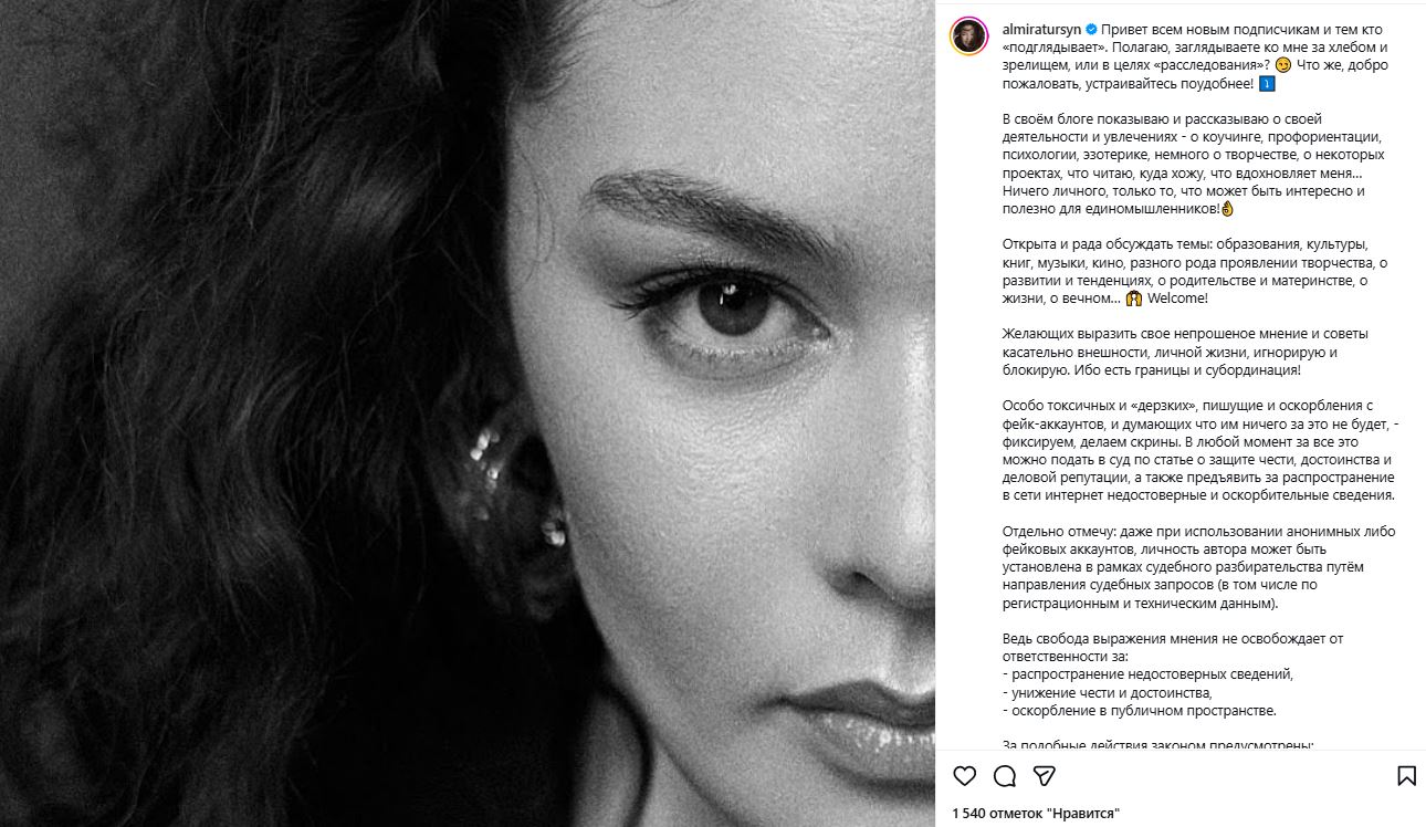 В своем обращении актриса отметила, что ее блог – это открытое пространство для единомышленников, где она делится профессиональной деятельностью и личными увлечениями. По словам Альмиры Турсын, в центре ее контента – коучинг, профориентация, психология, элементы эзотерики, творчество, книги, культура, кино и темы личностного развития. При этом актриса подчеркнула: личную жизнь она выносит в публичное поле только в той мере, в какой это может быть полезно и интересно аудитории.