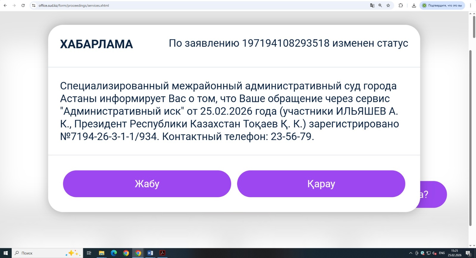 «На фоне происходящего в стране «бардака» вокруг Конституции был вынужден подать в суд на президента Токаева (Aqorda) иск об оспаривании законности его указа о назначении референдума. СМАС г.Астана зарегистрировал его», – написал Альнур Ильяшев в социальной сети Facebook.