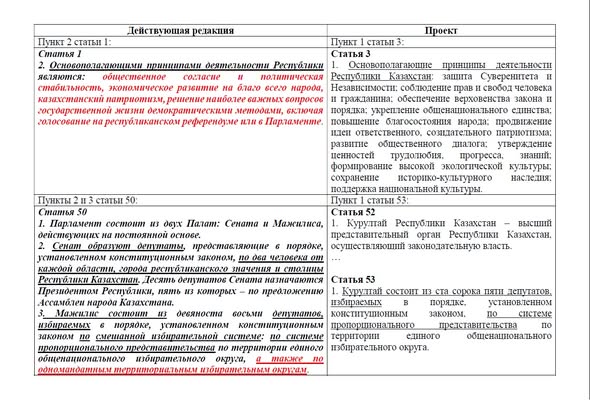 которые могут повлечь за собой нарушение конституционных прав и свобод человека и гражданина; изменения независимости государства, унитарности и территориальной целостности республики, формы ее правления, основополагающих принципов деятельности республики, положения о том, что президент республики избирается сроком на семь лет и одно и то же лицо не может быть избрано президентом республики более одного раза…«Посредством принятия проекта устанавливается новый порядок формирования (избрания депутатов) Курултая Республики Казахстан – высшего представительного (законодательного) органа: только по системе пропорционального представительства (через списки кандидатов-членов политических партий), что нарушает существующее конституционное право граждан самостоятельно выдвигать свою кандидатуру в сенат и мажилис парламента Республики Казахстан (пункты 2 и 3 статьи 50 действующей Конституции)», – пояснил Альнур Ильяшев.