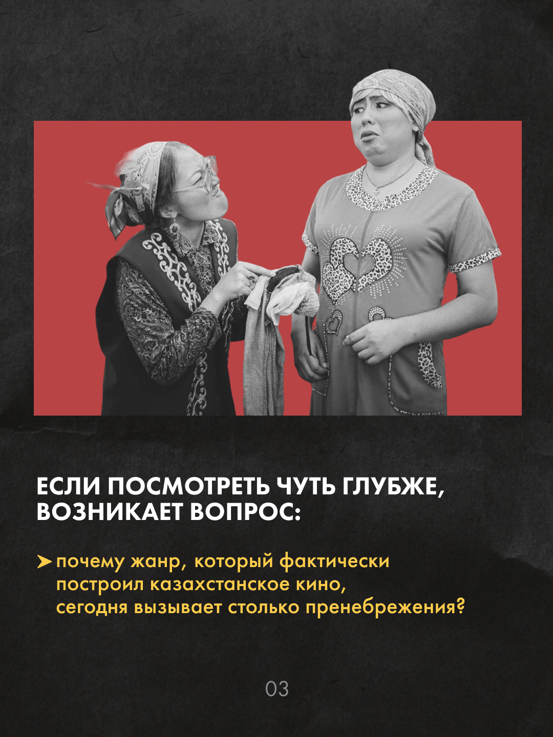 Но если посмотреть на индустрию шире, становится понятно: именно комедия долгие годы была основой казахстанского кино. Она собирала полные залы, формировала у зрителя привычку ходить на отечественные фильмы и во многом популяризировала казахский язык в массовой культуре. Сегодня жанр продолжает развиваться. Все чаще комедии поднимают реальные социальные темы, но делают это легко и доступно, без морализаторства – через смех и узнаваемые жизненные истории.