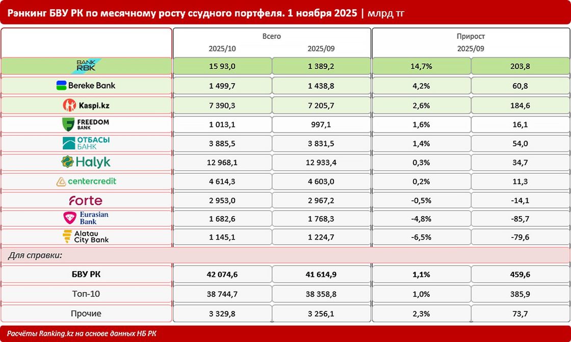 Абсолютный лидер по месячному росту — Bank RBK, увеличивший портфель займов сразу на 14,7%, до 1,59 трлн тг. В стоимостном выражении рост составил 203,8 млрд тг, это рекорд по всему сектору. С начала года рост ссудного портфеля в банке достиг уже 41,7%, при общем росте в среднем по сектору лишь на 17,4%.