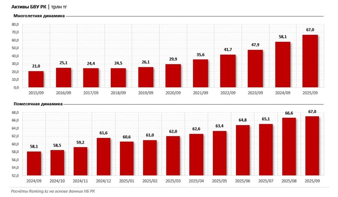 К 1 октября текущего года активы казахстанских банков превысили 67 трлн тенге, прибавив за месяц 0,6%, в основном за счет роста ссудного портфеля на 1,8%, до 41,6 трлн тенге, сообщает Ranking.kz.