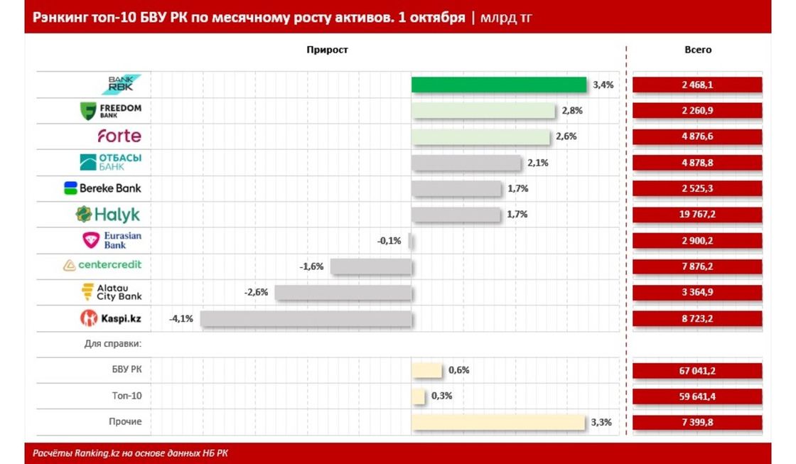 По месячному росту активов среди крупнейшей десятки уверенно лидирует Bank RBK: плюс 3,4%, до 2,5 трлн тенге. В годовой динамике показатели банка увеличились уже на 13,1%.