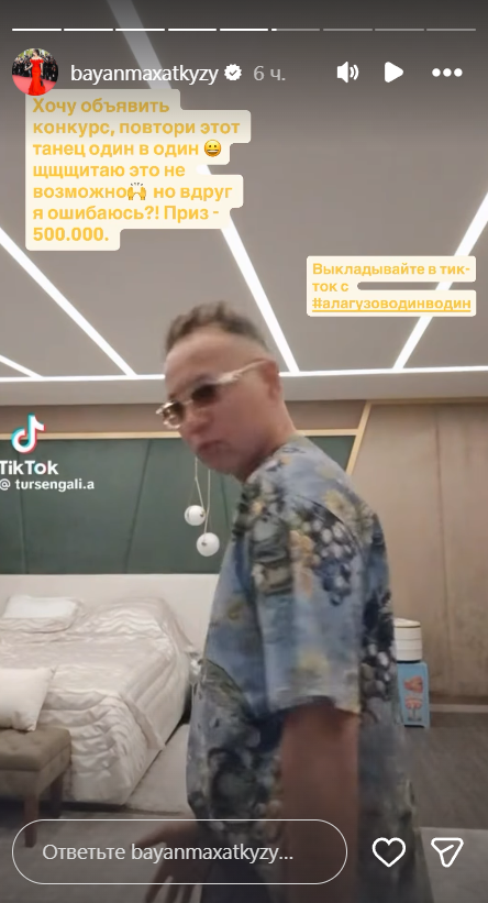 "Хочу объявить конкурс "Повтори этот танец один в один". Считаю, это невозможно, но вдруг я ошибаюсь?! Приз – 500 тысяч тенге", – написала она в сторис своего аккаунта в instagram.