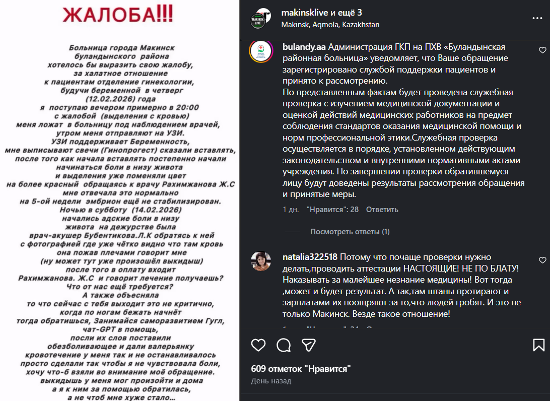 Жительница Акмолинской области опубликовала в соцсетях жалобу на халатное отношение медицинского персонала гинекологического отделения Буландынской районной больницы, расположенной в городе Макинск, передает Liter.kz.