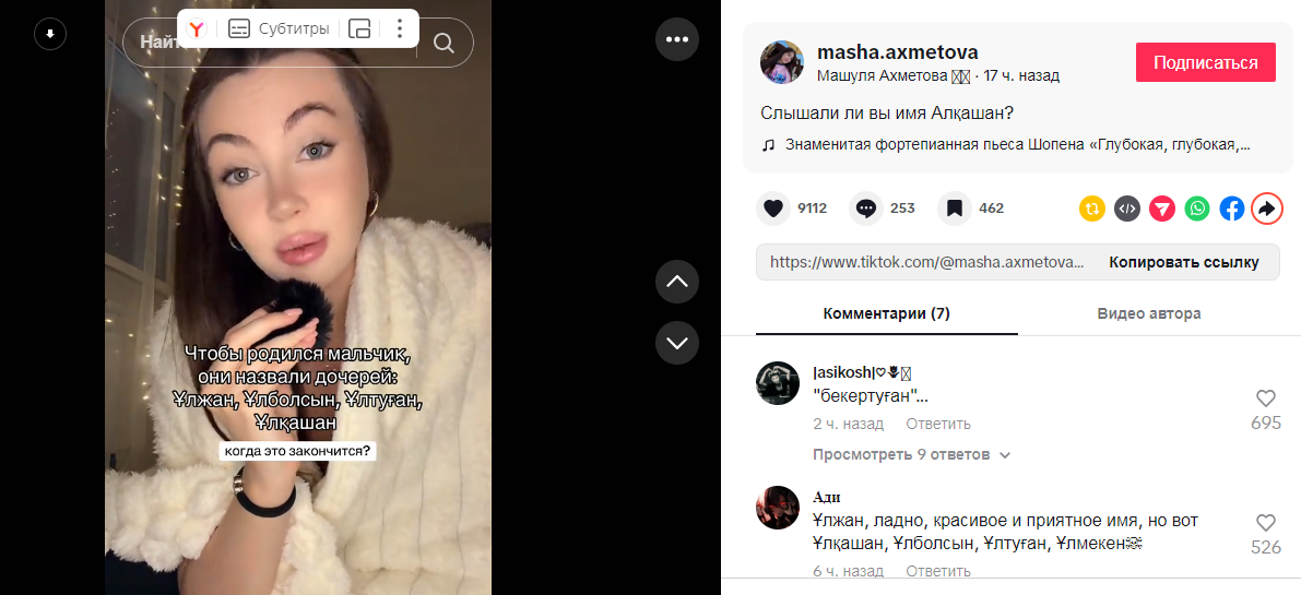 Поводом для обсуждения стало видео, опубликованное алматинкой Марией Ахметовой в социальной сети TikTok. В своем ролике она рассуждает о значении традиционных женских имен, которые, согласно казахским поверьям, давались девочкам в надежде на рождение в семье мальчика. По ее словам, в современных реалиях такие имена могут становиться источником внутренних переживаний и психологического дискомфорта для девушек.