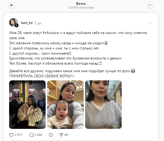 Пользователи соцсетей активно делятся личными историями и мнениями в комментариях. Многие отмечают, что подобные имена нередко воспринимаются как навязанный сценарий и могут влиять на самооценку. В связи с этим все больше казахстанок признаются, что задумываются о смене имени, стремясь избавиться от негативных ассоциаций и обрести внутренний комфорт.