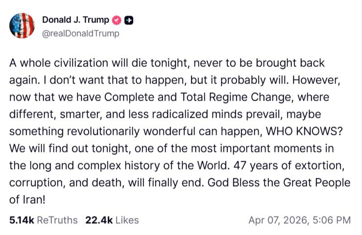 «Сегодня ночью погибнет целая цивилизация, и её уже никогда не вернуть. Я не хочу, чтобы это произошло, но, вероятно, так и будет. Однако теперь, когда произошло полное и тотальное изменение режима, где преобладают другие, более умные и менее радикальные взгляды, возможно, произойдёт что-то революционно замечательное — кто знает?» заявил Трамп.