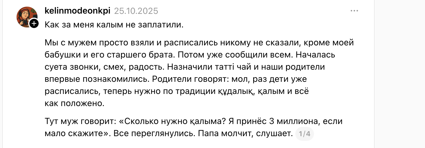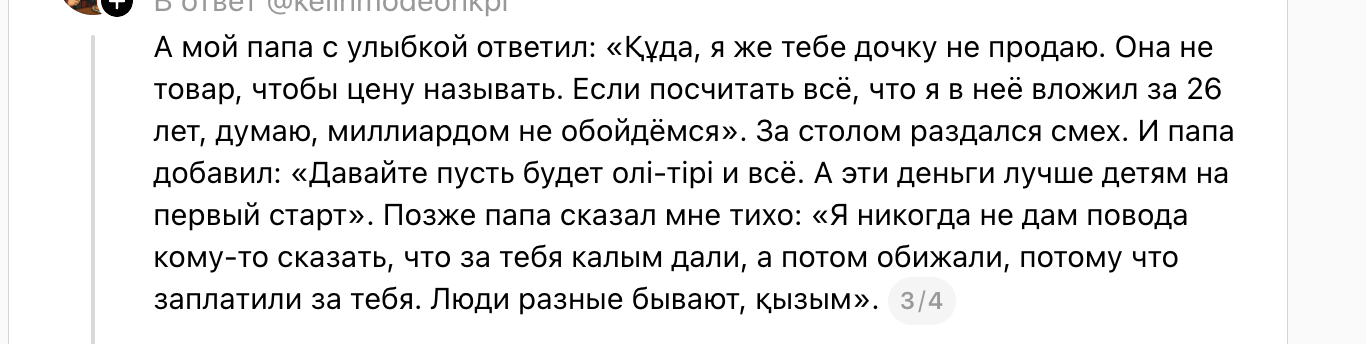 «Меня зовут Айла, мне 26 лет, я из Шымкента, недавно вышла замуж. В Шымкенте калым есть давно и с каждым годом цена растет. Сейчас у нас калым начинается примерно от 2,5 млн тенге — со стороны мужа моей семье подарили 5 млн. Приданое родители мне отдельно не готовили, но у меня есть квартира в Алматы — они подарили её раньше, она полностью обставлена, мы с мужем планировали жить там и сейчас живём. Свадьба прошла по всем традициям: семьи обменивались золотыми украшениями, дорогой одеждой. Но я в эти вопросы не вмешивалась — всё решали родители. Кыз узату и той провели в роскошном ресторане, как они и хотели, а затем на природе отметили кудалык. Так прошло наше торжество», — рассказала Айла.