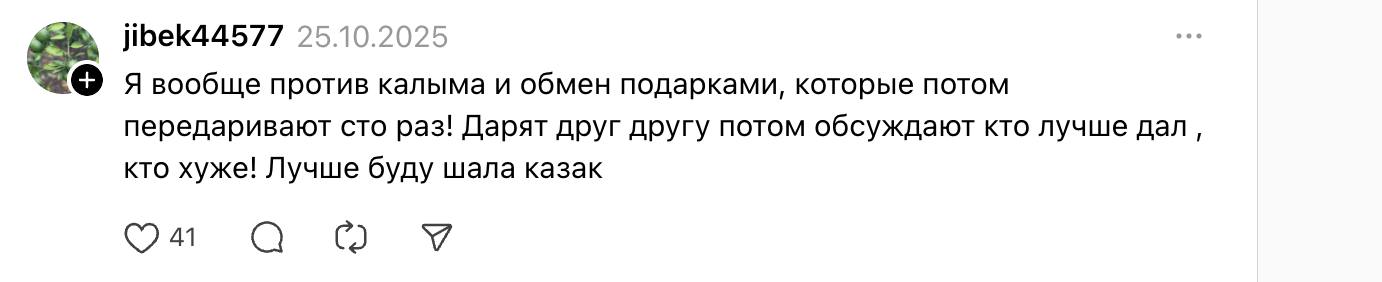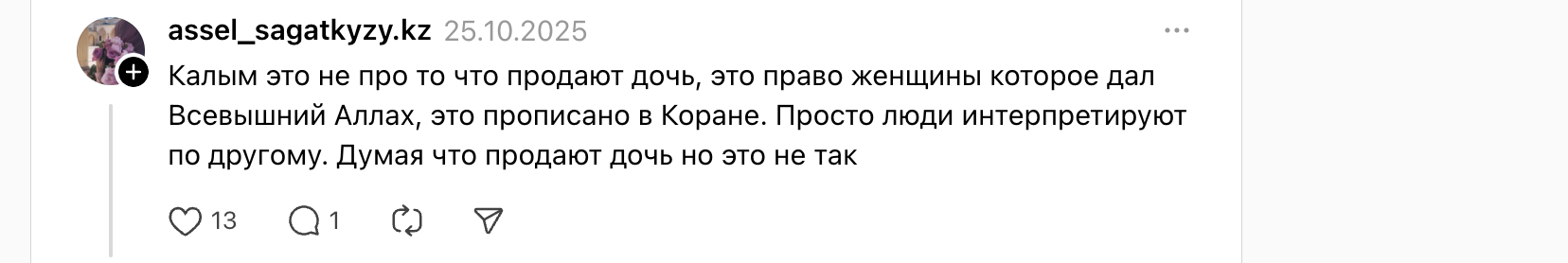 В социальных сетях не утихают споры о калыме. Одни пользователи считают его неотъемлемой частью древних традиций и рассказывают, что этот обычай необходимо сохранять. Другие, напротив, выступают против, заявляя, что «девушек не продают» и современная свадьба может обойтись без подобных выплат.