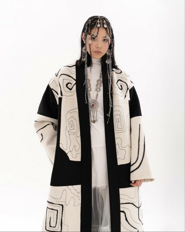 Вместе с признанным мэтром они создали первую совместную коллекцию с чапанами в этностиле: черно-белые, серо-белые, в спокойных тонах с геометрическим рисунком. На это их вдохновили ковры текемет и узоры на них. Просто однажды в какой-то поездке будущий дизайнер национальной одежды зашла в бутик старинных казахских вещей, ковров и украшений, где встретила женщину, которая занималась коллекционированием старинных ковров. У нее был огромный каталог, она-то и рассказала все про их узоры, рисунки. Все это повлияло на творчество Акмарал.
