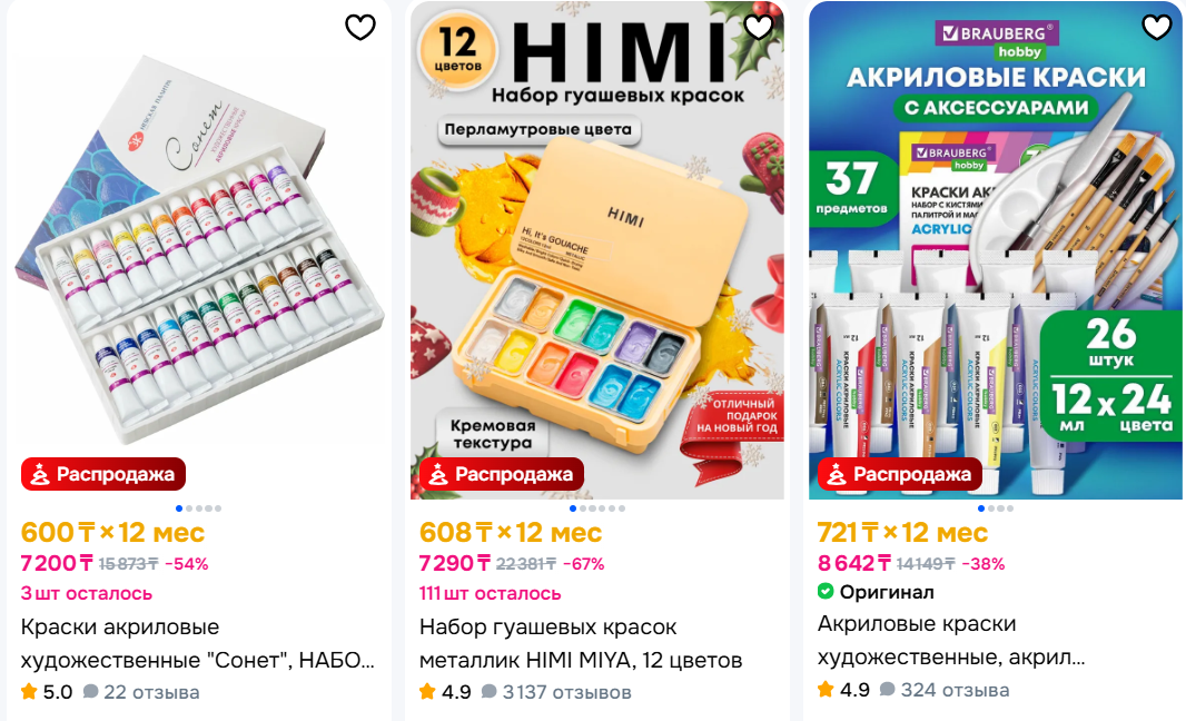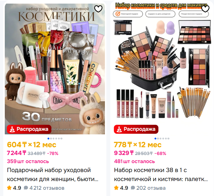 В специализированных косметических магазинах можно найти палетки теней для век и другие продукты. Их стоимость, как правило, начинается от 5000 тенге. При этом на маркетплейсах можно найти наборы декоративной косметики в той же ценовой категории, но с более широким наполнением – в комплект часто входят сразу несколько продуктов, что делает такой вариант более выгодным, разнообразным по наполнению и более приятным для получательницы.