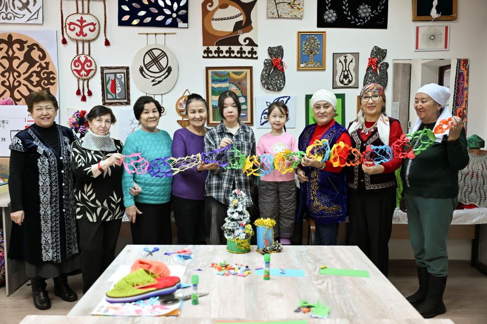 К главному зимнему празднику пенсионеры здесь начинают готовиться заранее. В преддверии Нового года по доброй традиции они мастерят поделки для ребятишек из школ, детских садов и социальных учреждений. А недавно бабушки провели целый мастер-класс для учеников школы-гимназии № 2 им. Г. Кайырбекова.