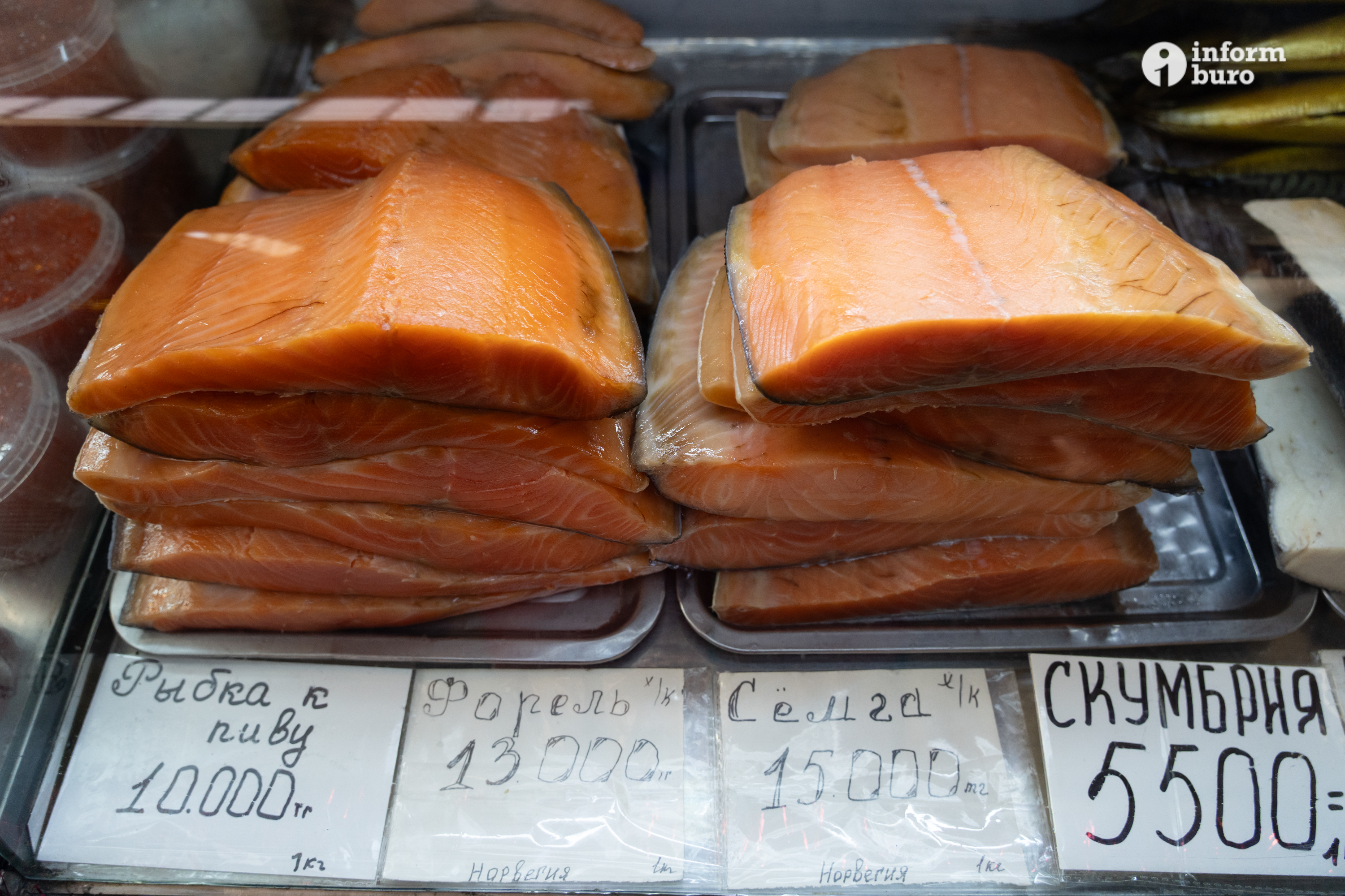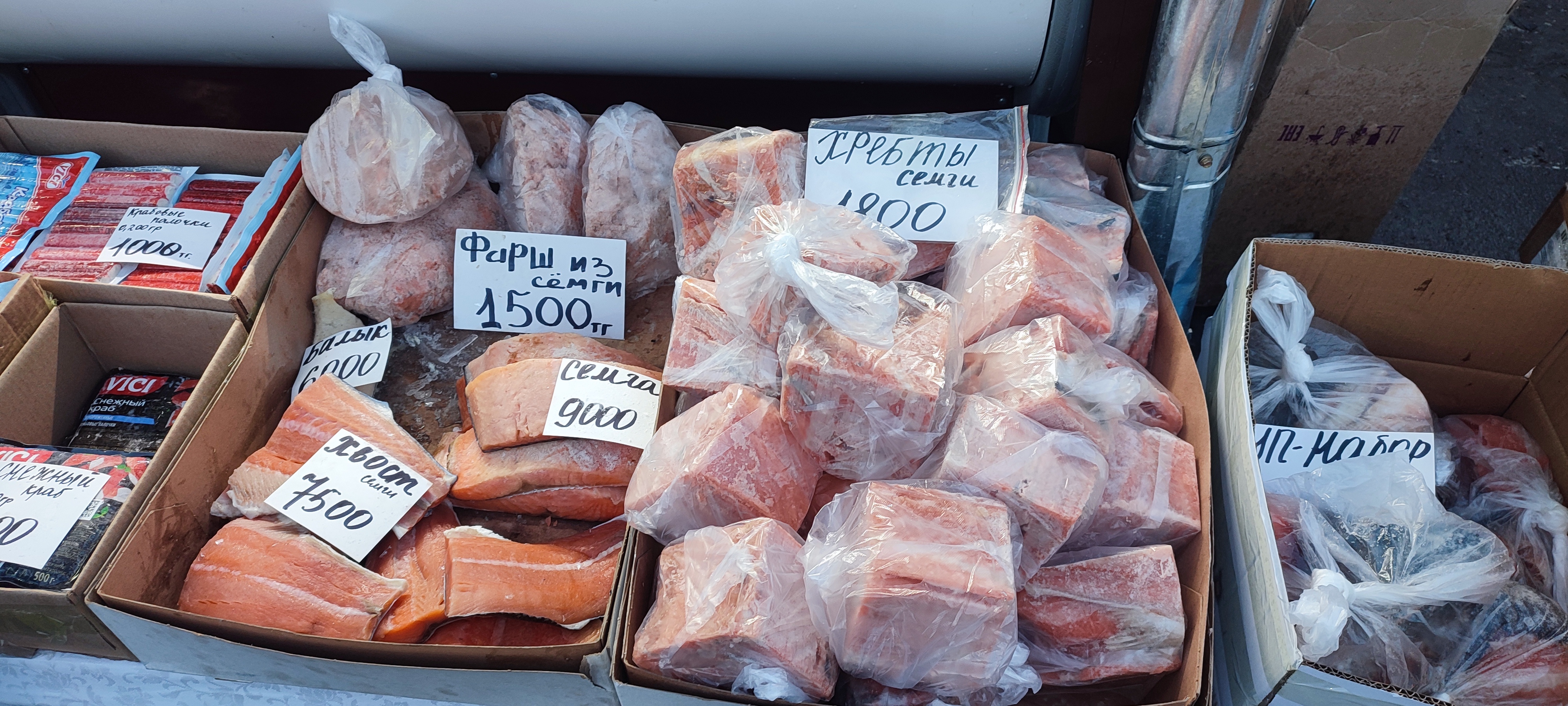 На рынках стоимость замороженных стейков сёмги колеблется в пределах 8000–9000 тенге за килограмм. Тем, кто хочет сэкономить, предлагают части подешевле: хвосты обойдутся в 7500 тенге, а хребты и фарш – в 1800 и 1500 тенге соответственно. В разгар сезона продавцы редко идут на уступки, поэтому актуальные цены, как правило, окончательны и сразу указаны на прилавках.